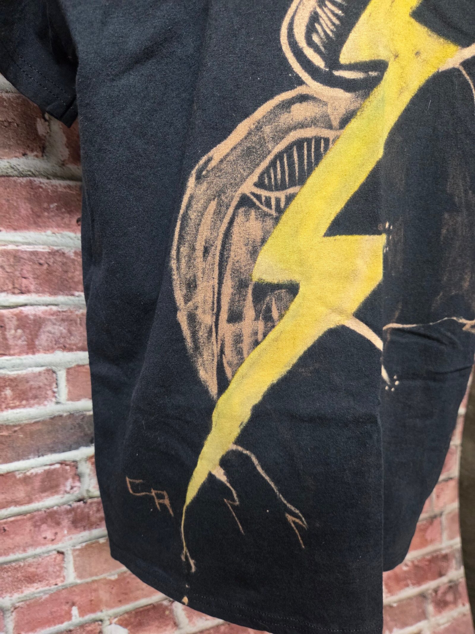 The bolt is hand-applied in raw yellow, intentionally imperfect, cutting diagonally through the body like a rupture in time. Surrounding marks resemble shockwaves, scorched air, and unstable energy lines—evidence of impact rather than control.