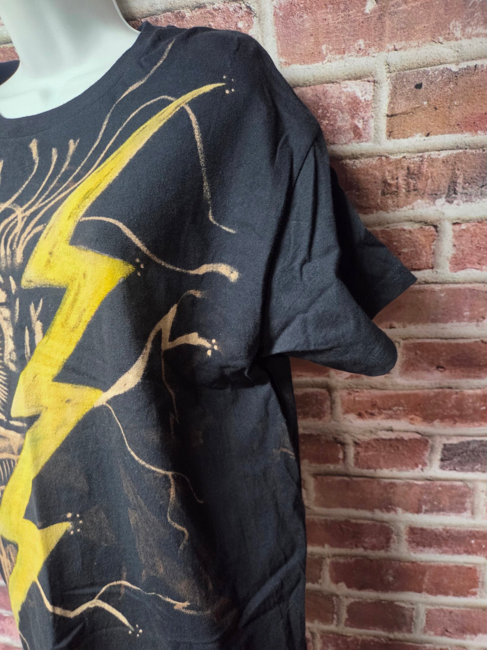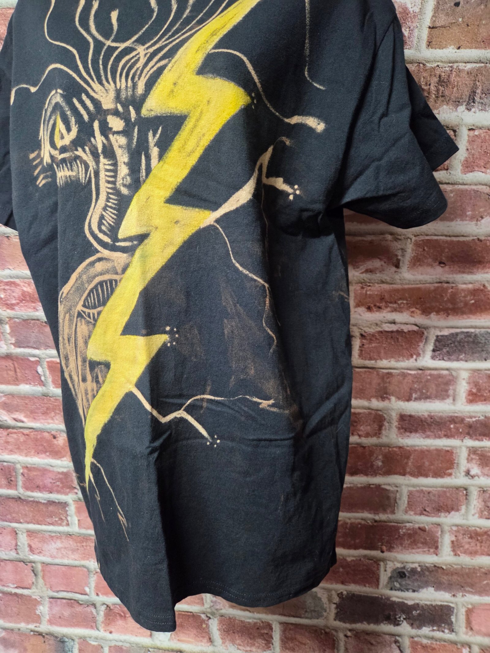 The figure fractures across the shirt as the lightning bolt tears through the composition, splitting the god and the garment simultaneously. The eye is wide, feral, awakened—not ruling, but reacting. This is divinity stripped of ceremony.